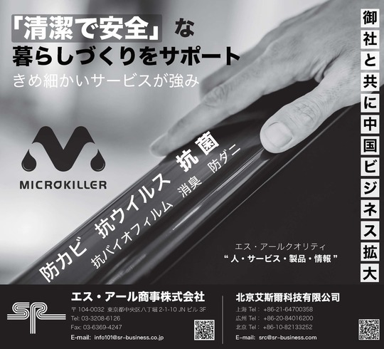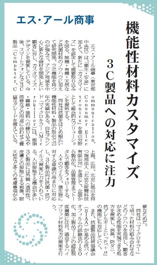 エス・アール商事(東京都中央区)は、「衛生・安全」に加えて、新たに「カスタマイズ」を訴求して需要取り込みを図る。無機・有機・天然など抗菌材料のノウハウに加えて研究開発、ラボ機能を持つのが強みで、アジア地域を中心に新たな商材を開発したい顧客に対し、カスタマイズ・デザインを提案している。今後、スマートフォンなど3C製品「Computer、  Communication、Consumer Electronics」を重点分野として総合的なソリューションを提供する。